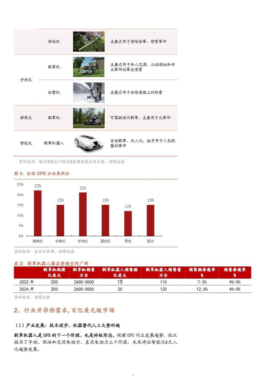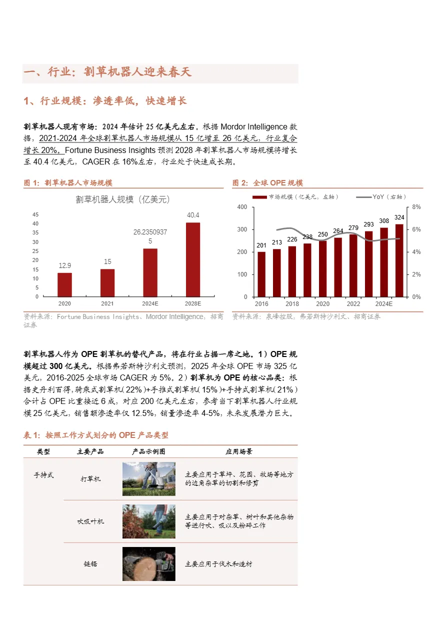 • 百亿美金级蓝海市场,渗透率仍处低位:2024年全球割草机器人市场规模约25亿美元,预计2028年将达40.4亿美元(CAGR 16%)。当前欧美销量渗透率不足5%,北美市场渗透率更是低于5%,相较OPE整体市场体量(325亿美元),替代空间巨大。
