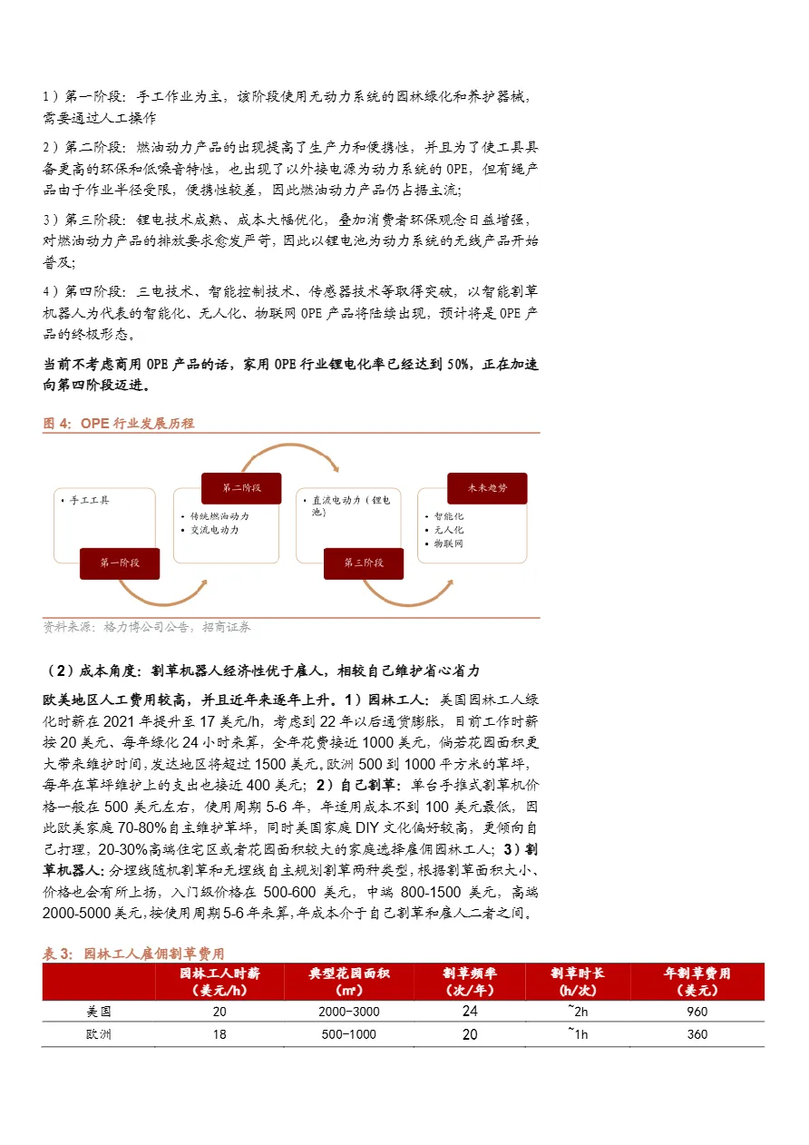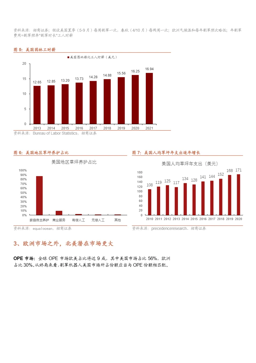 • 北美市场潜力远超欧洲,成兵家必争之地:尽管目前欧洲占全球销量70%以上,但美国草坪面积更大、人工成本更高,潜在市场需求更旺。当前北美渗透率不足5%,远低于其在OPE市场的56%份额,未来增长弹性极大。