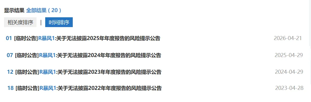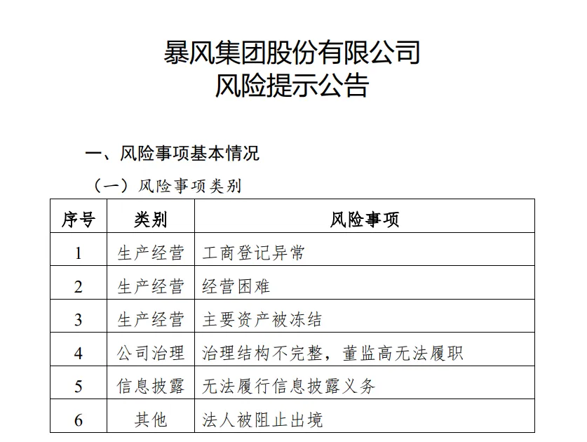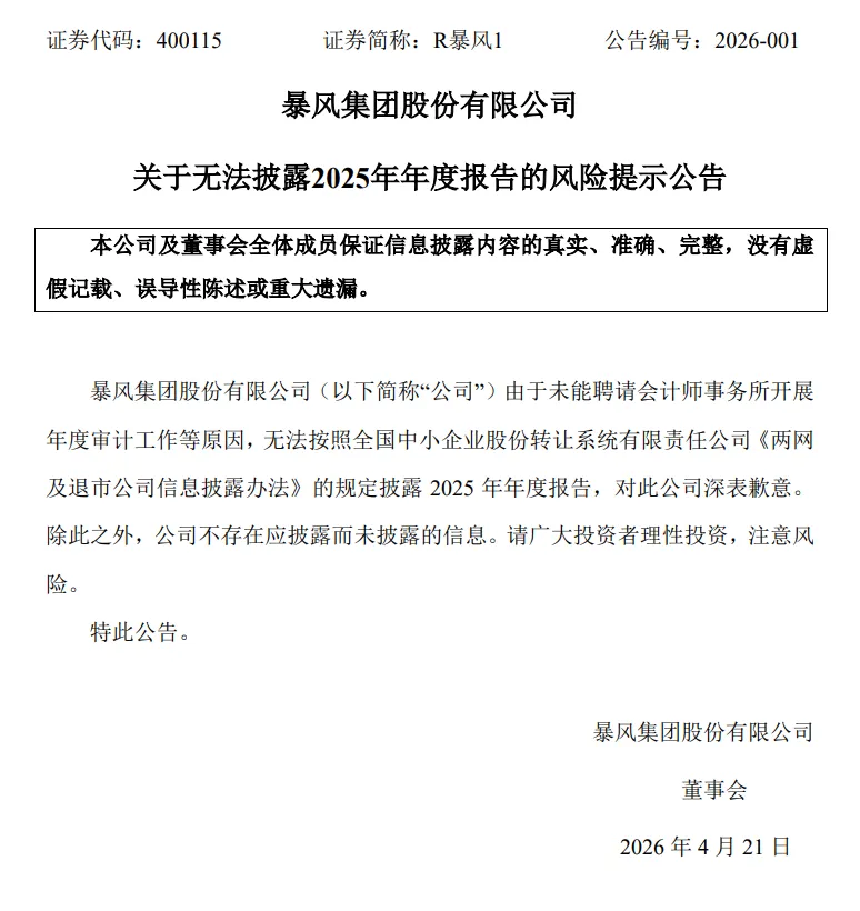 退市A股公司暴风集团股份有限公司(股转代码400115.NQ,原A股代码300431.SZ )于2026年4月21日晚发布了《关于无法披露2025年年度报告的风险提示公告》。公告显示,暴风集团股份有限公司(以下简称“公司”)由于未能聘请会计师事务所开展年度审计工作等原因,无法按照全国中小企业股份转让系统有限责任公司《两网及退市公司信息披露办法》的规定披露2025年年度报告,对此公司深表歉意。除此之外,公司不存在应披露而未披露的信息。