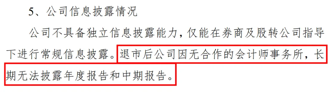 暴风集团于2020年11月9日被深圳证券交易所终止上市,2022年11月4日起在全国中小企业股份转让系统开始转让。在2025年12月31日,该公司披露:公司不具备独立信息披露能力,仅能在券商及股转公司指导下进行常规信息披露。退市后公司因无合作的会计师事务所,长期无法披露年度报告和中期报告。