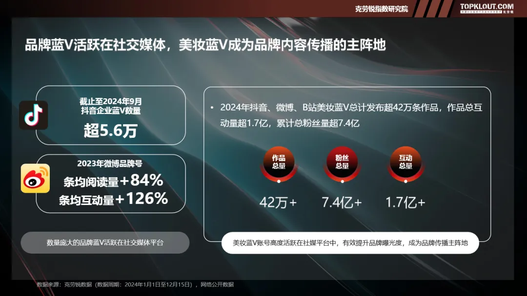 • 抖音成美妆品牌最大流量池:截至2024年12月,抖音美妆蓝V粉丝总量突破6亿,月均发布内容超3万条,月均互动量达798万+,短视频播放量同比增长14.3%,直播增长18.9%,是品牌吸粉与转化的核心阵地。