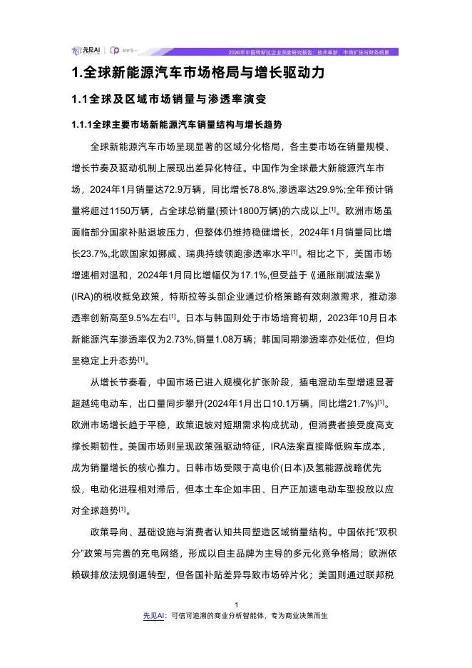 全球新能源汽车市场呈现显著的区域分化格局,各主要市场在销量规模、 增长节奏及驱动机制上展现出差异化特征。中国作为全球最大新能源汽车市场,2024年1月销量达72.9万辆,同比增长78.8%,渗透率达29.9%;全年预计销量将超过1150万辆,占全球总销量(预计1800万辆)的六成以上。欧洲市场虽面临部分国家补贴退坡压力,但整体仍维持稳健增长,2024年1月销量同比增 长23.7%,北欧国家如挪威、瑞典持续领跑渗透率水平。相比之下,美国市场增速相对温和,2024年1月同比增幅仅为17.1%,但受益于《通胀削减法案》 (IRA)的税收抵免政策,特斯拉等头部企业通过价格策略有效刺激需求,推动渗透率创新高至9.5%左右。日本与韩国则处于市场培育初期,2023年10月日本新能源汽车渗透率仅为2.73%,销量1.08万辆;韩国同期渗透率亦处低位,但均呈稳定上升态势。