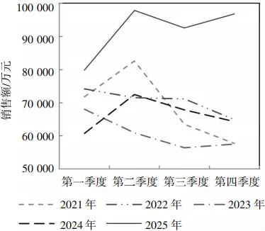 综合2021年至2025年的数据,如图7和图8所示,“十四五”期间各年分季度的电加工机床销售情况呈现出曲折多变的走势。由图7可见,2025年前三季度的销售额变化与2024年相似,第一季度的销售量处于五年间的中等水平,第二季度的销售量一跃达到五年中的最高点,第三季度的销售量虽然环比略有下降,但是仍然处于五年中同季度的最高点,第四季度的销售量则实现了五年同期的最大增幅。根据图8,2025年的分季度销售额走势亮眼,各季度销售额均处于五年中的高位,与其他年度相比有较大的增幅,尤其是第二季度的销售额相比于前四年同期的峰值(出现在2021年第二季度)高出了18.47%。
