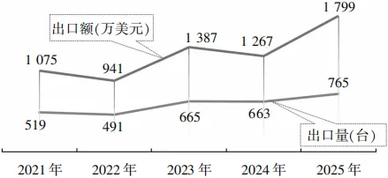 根据分会统计的26家电加工机床主机生产企业数据,2025年电加工机床的出口总量为1 832台(套),出口总额为8 227万美元。为更好地对比“十四五”期间的各年度电加工机床出口总量和出口总额情况,如图9和和图10所示,分会以各年度统计范围内一致的23家主机生产企业数据作分析。