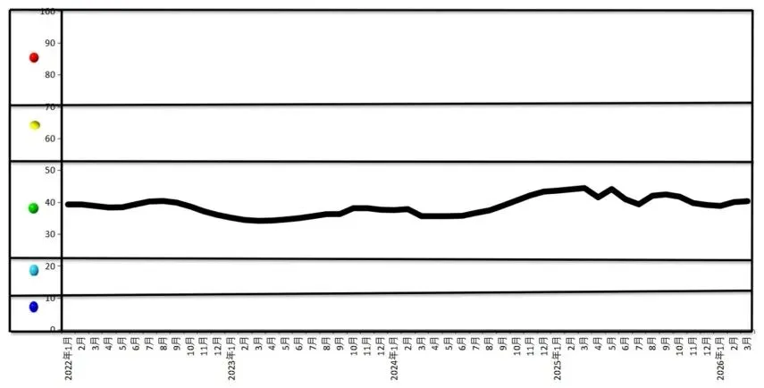 中国铜产业月度景气指数监测模型结果显示,2026年3月份,中国铜产业月度景气指数为40.3,较上月上升0.3个百分点,继续保持在“正常”区间运行;先行指数为79.5,较上月上升1.8个百分点;一致指数为75.1,较上月上升1.6个百分点。最近13个月中国铜产业月度景气指数见下表。