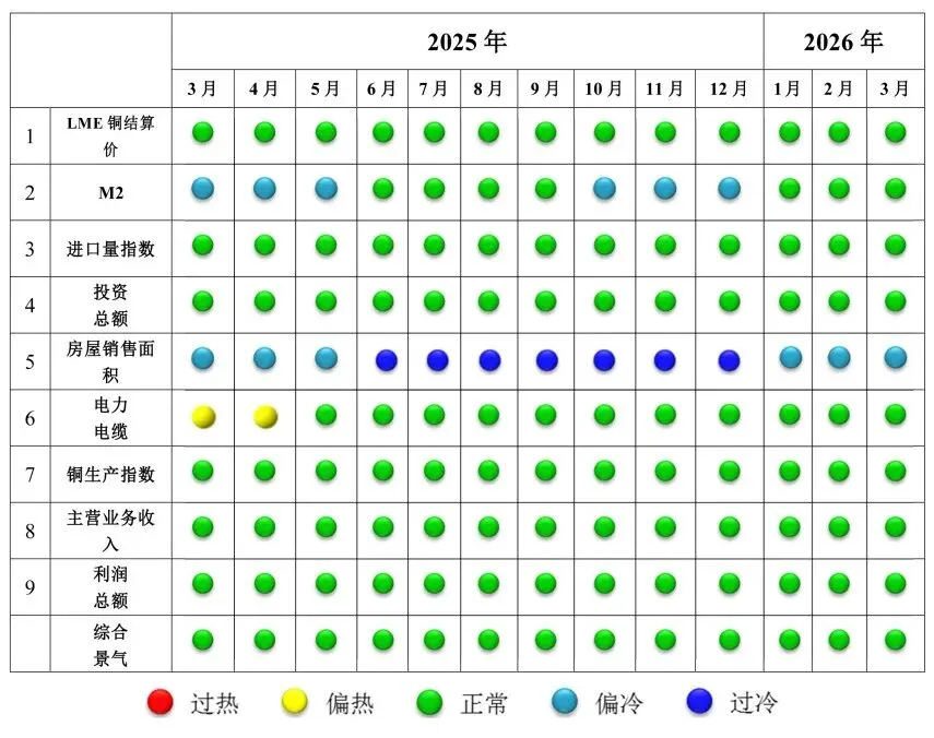 综上所述,3月份,中国铜产业整体运行稳健,景气指数为40.3,较上月微升0.3个百分点,持续处于正常区间;先行指数与一致指数同步上行,分别升至79.5和75.1,预示行业短期向好。从分项指标看,受美联储降息预期延迟、美元坚挺等因素影响,国际铜价有所回落;货币供应量保持稳定,货币政策稳健。铜产品进口节奏调整、固定资产投资略有回落,行业投资更趋理性。房地产市场持续回升但仍偏冷,电力电缆、精铜产量小幅回调,受季节性与盈利因素影响短期供给放缓。企业营收及利润总额指数均有所提升,在铜价回暖、下游需求恢复及成本稳定的共同作用下小幅上行。