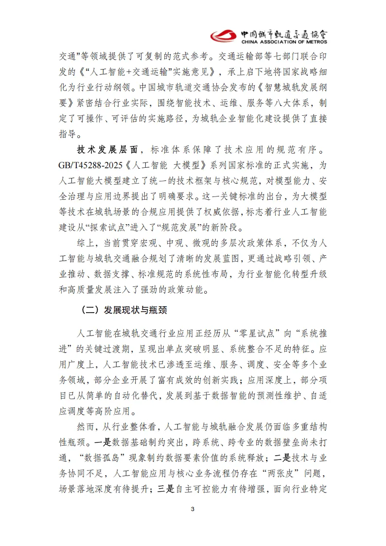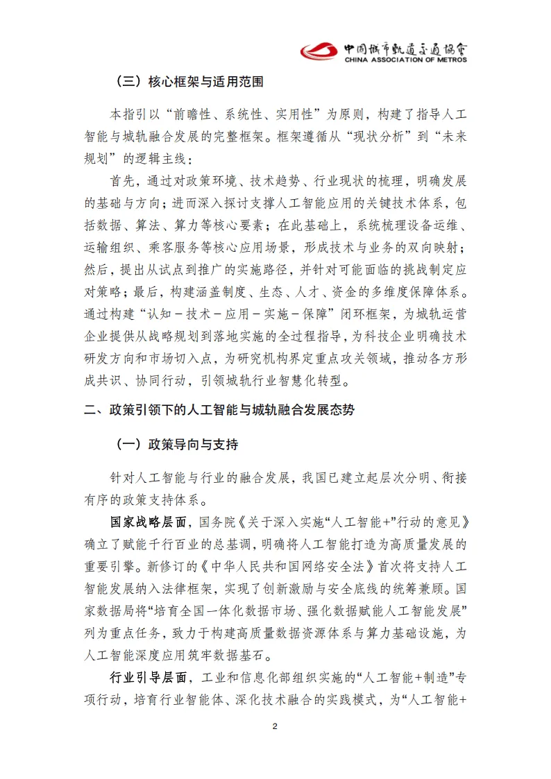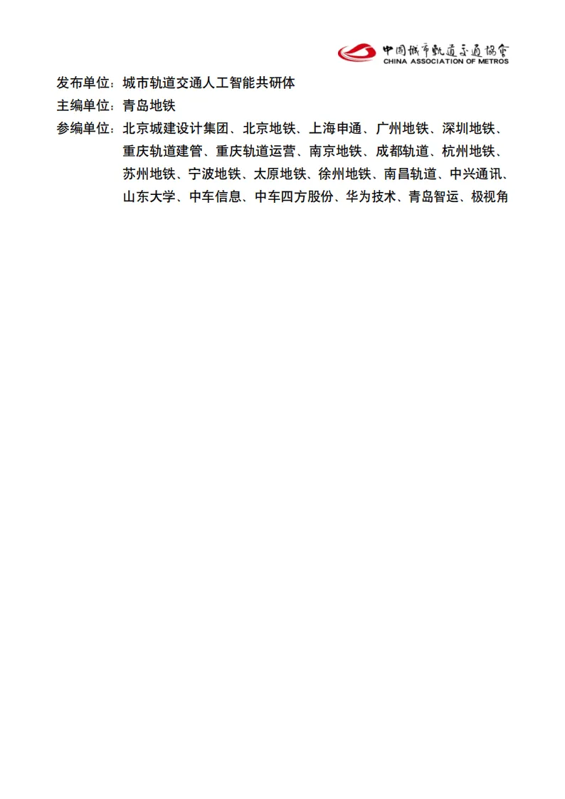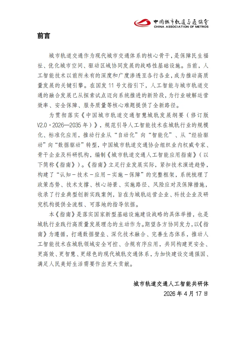 《城市轨道交通人工智能应用指南》由城市轨道交通人工智能共研体发布,青岛地铁主编,多家地铁运营单位、科技企业与科研机构共同参编,旨在规范人工智能在城轨行业的规模化、标准化应用,推动行业从自动化向智能化、经验驱动向数据驱动转型。
