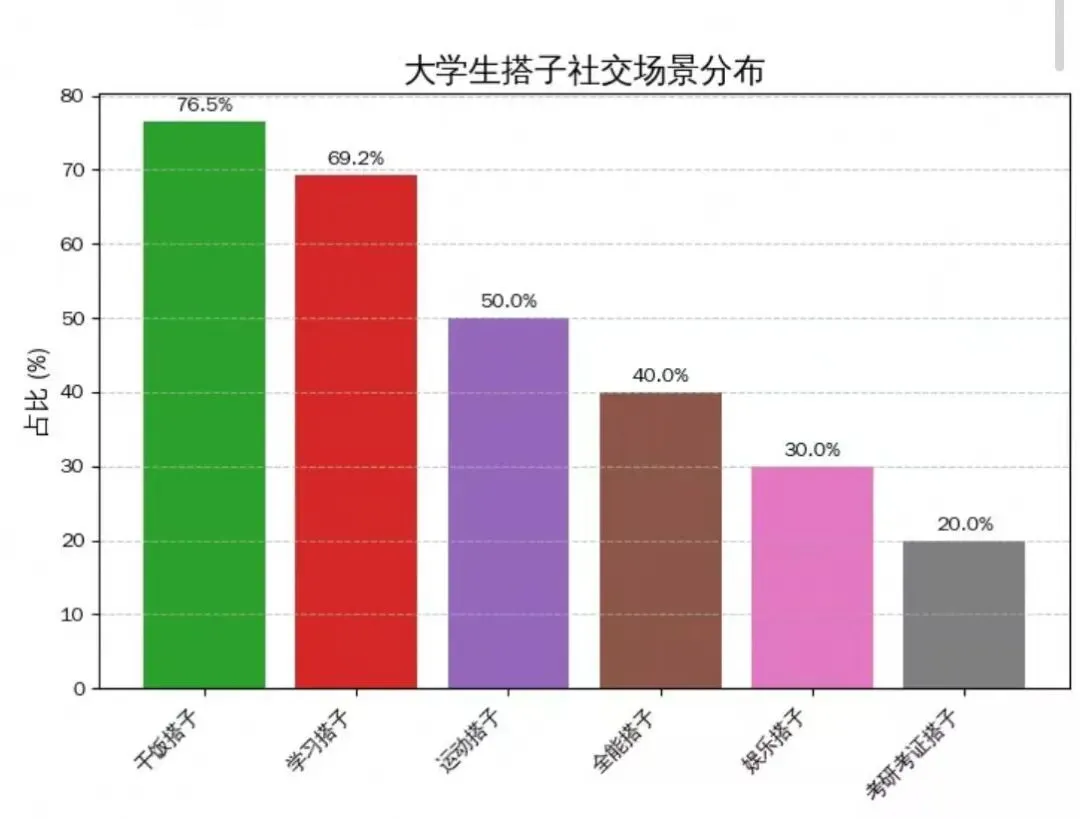 摘要:在当代大学校园,传统深度交友模式逐渐被轻量化、场景化的“搭子社交”取代,这种介于普通同学与亲密好友之间的新型社交关系,覆盖学习、饮食、运动、娱乐等全场景,成为当代大学生主流社交选择。本次调研以汉语言文学专业在校学生为核心调研群体,辅以跨专业抽样调研,通过一对一访谈、问卷调查、案例剖析等方式,拆解大学生搭子社交的成因、类型、相处模式及社交心理,结合数据可视化分析,解读当代青年在社交需求与自我独处之间的平衡之道,探究轻量化社交背后的青年社交观念变革。