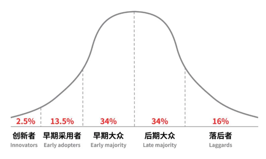 根据“创新扩散理论”,因为不同的人接受市场的速度是不一样的,我们按照渗透率来判断产业所处的生命周期。(渗透率反映的是用户的接受程度,即产业已经触达了多大比例的潜在用户,渗透率=存量用户÷潜在客户群)