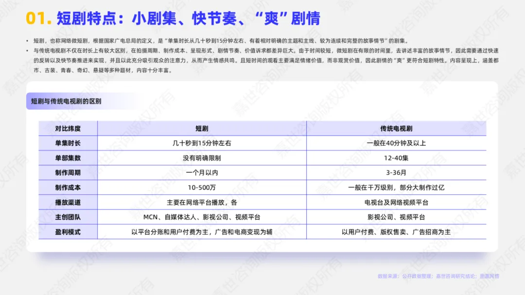 • 制作门槛低但同质化风险上升:单部短剧制作周期可控制在一个月内,成本低至10万元起,吸引大量MCN、品牌服务商转型入场,未来或将面临内容同质化与平台流量内卷的双重压力。