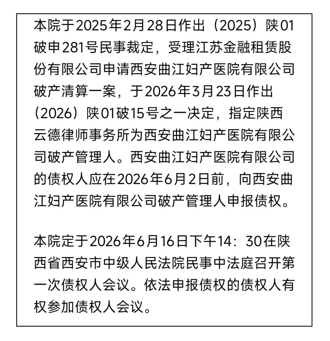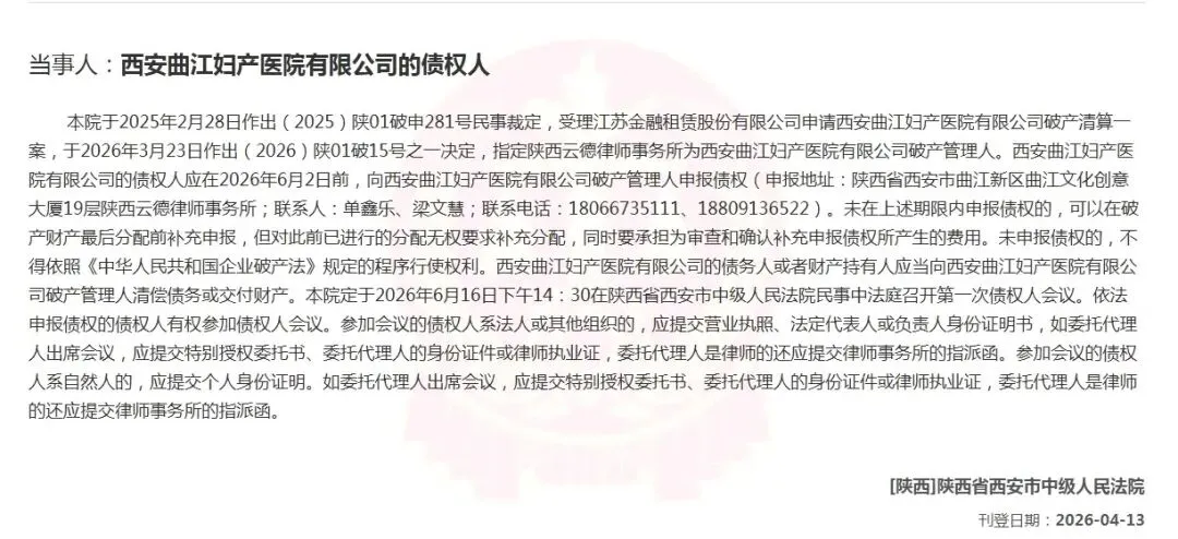 4月13日,中国法院公告网刊登了西安曲江妇产医院有限公司的债权人的破产文书,其中表述: