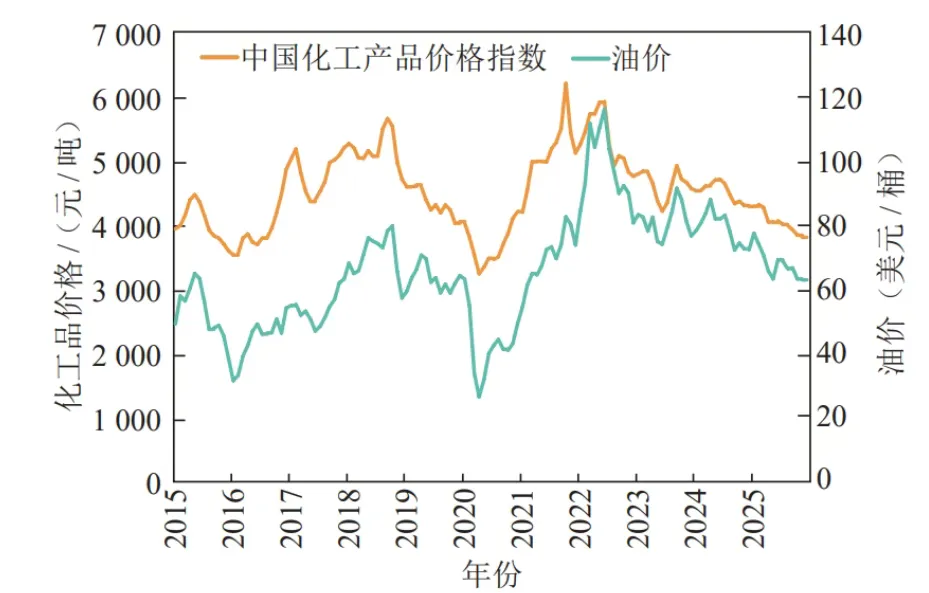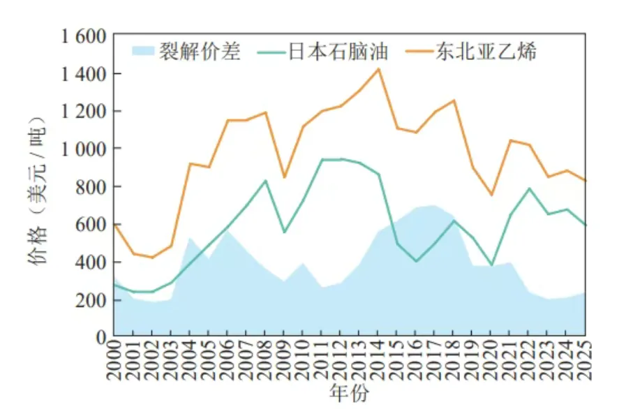 近年来,国内大宗化学品价格与国际原油价格的相关性显著减弱,传统的“油价主导”定价模式正在发生深刻转变。特别是2022年以来,受俄乌冲突等地缘政治风险等因素影响,国际油价一度突破100美元/桶,带动全球大宗商品价格快速上涨。然而,国内石化产业链的盈利水平并未同步改善,反而因成本大幅攀升而承受巨大压力,行业利润整体下行甚至出现亏损。两者的相关系数跌至0.1左右,远低于0.6~0.9的历史平均水平。造成这种“脱钩”现象的核心原因在于供需结构的失衡。从供应端看,高油价直接推高了石脑油等基础原料价格,使以石脑油为路线的乙烯等装置生产成本大幅攀升。但从需求端看,受疫情等因素制约,国内消费增长动力不足,同时大量新增产能集中投放,使得消费增速远低于供给增速,“高成本、弱需求、强供给”格局导致产业链成本传导机制受阻。下游行业对高价原料的接受度有限,石化产品价格上涨乏力,石脑油—乙烯裂解价差长期徘徊在200美元/吨低位,甚至出现倒挂,众多一体化及下游化工企业陷入阶段性持续亏损。此现象表明,国内石化产品定价机制已由“成本推动”主导,逐步转变为由“成本支撑”、“供需基本面”与“国内产能结构”多重因素共同主导的复杂博弈格局。2015—2025年布伦特油价走势见图1,2000—2025年石脑油和乙烯价格走势见图2。