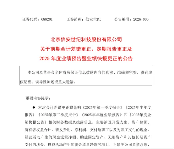 2026年4月18日,信安世纪发布的《关于前期会计差错更正、定期报告更正及2025年度业绩预告暨业绩快报更正的公告》