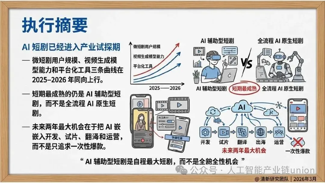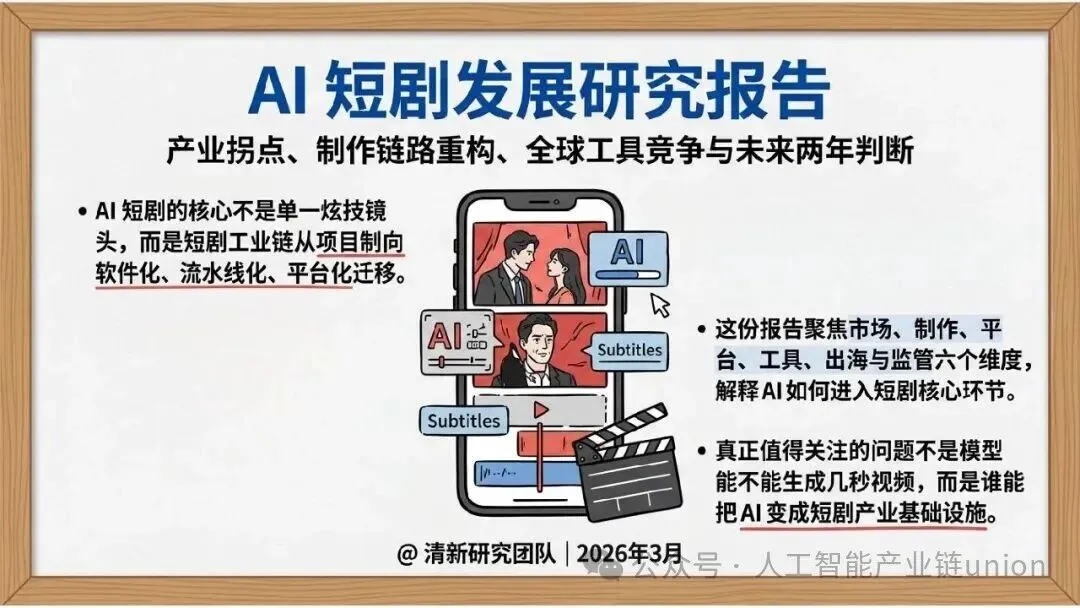 这份报告聚焦市场、制作、平台、工具、出海与监管六个维度,系统解释了AI如何进入短剧核心环节。真正值得关注的问题不是模型能不能生成几秒视频,而是谁能把AI变成短剧产业基础设施。