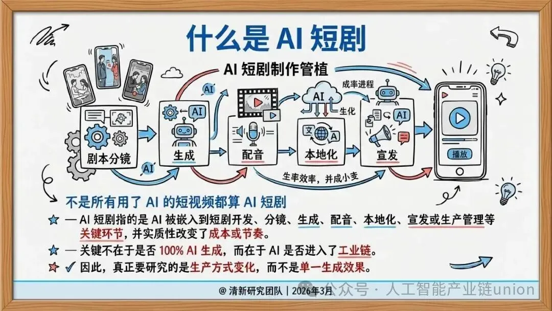 AI短剧指的是AI被嵌入到短剧开发、分镜、生成、配音、本地化、宣发或生产管理等关键环节,并实质性改变了成本或节奏。关键不在于是否100%AI生成,而在于AI是否进入了工业链。因此,真正要研究的是生产方式变化,而不是单一生成效果。