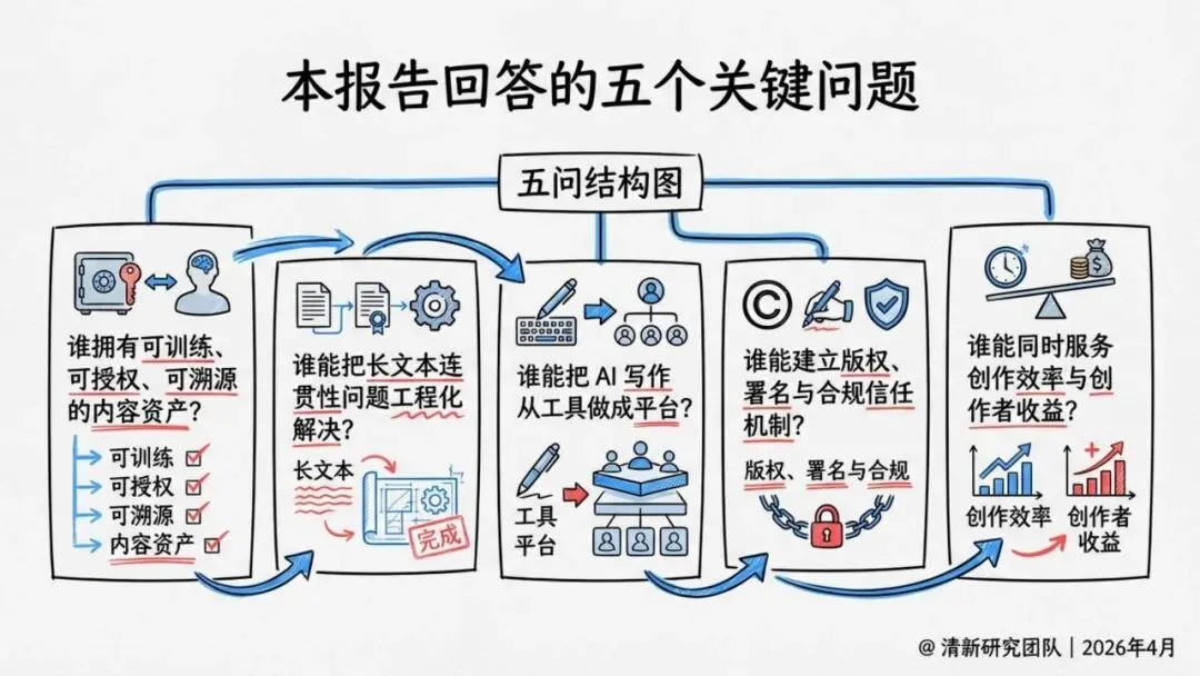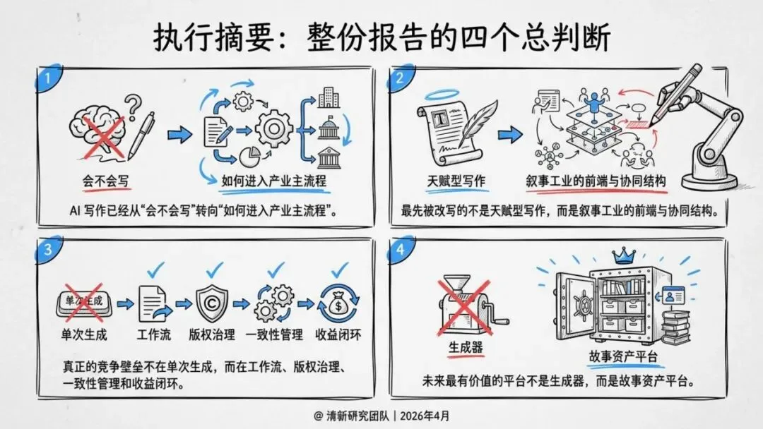 清华大学新闻学院/人工智能学院双聘教授沈阳团队最新发布的《人工智能写作深度研究报告》指出:AI写作的终局不是机器取代作者,而是让故事生产进入可编排、可协作、可结算的新工业阶段。