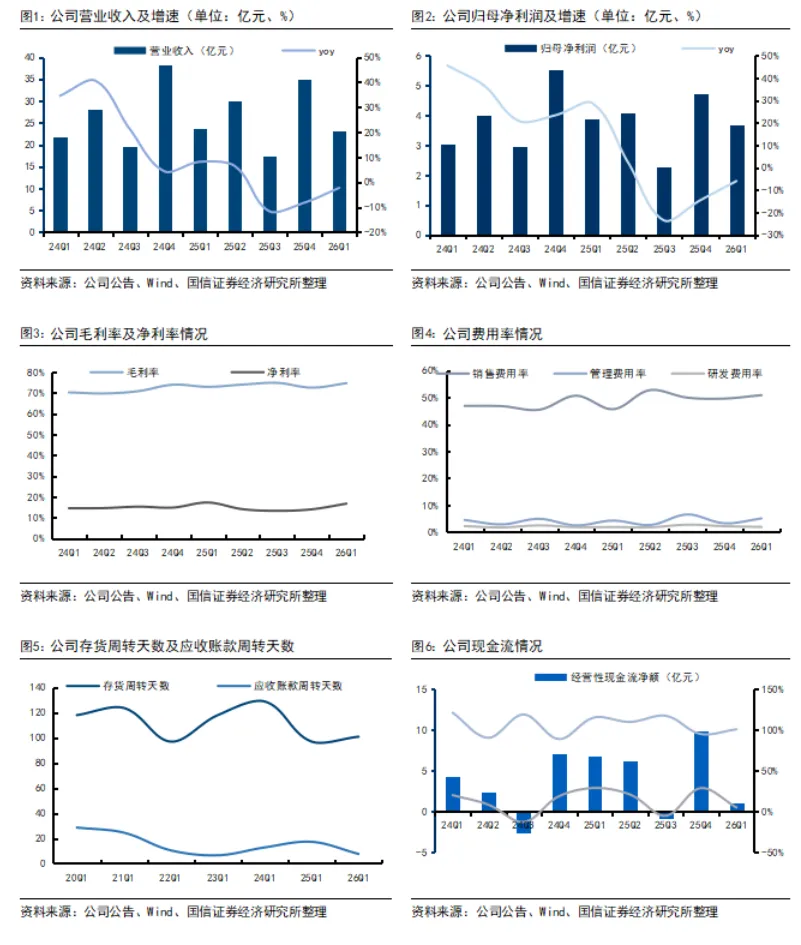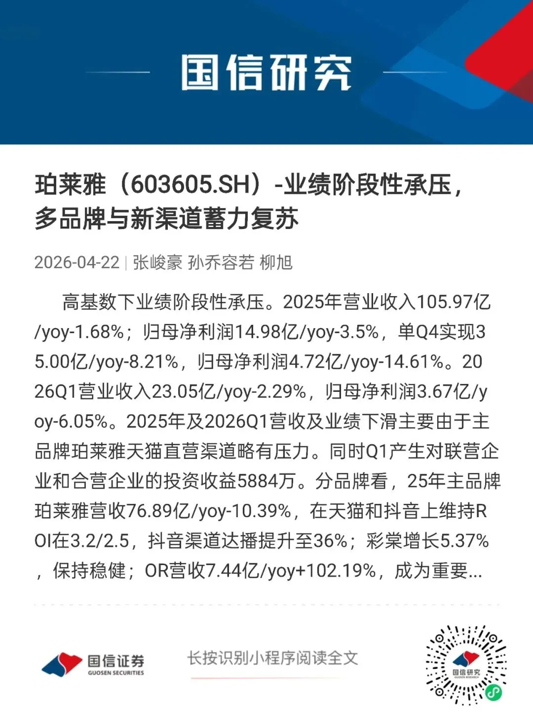 高基数下业绩阶段性承压。2025年营业收入105.97亿/yoy-1.68%;归母净利润14.98亿/yoy-3.5%,单Q4实现35.00亿/yoy-8.21%,归母净利润4.72亿/yoy-14.61%。2026Q1营业收入23.05亿/yoy-2.29%,归母净利润3.67亿/yoy-6.05%。2025年及2026Q1营收及业绩下滑主要由于主品牌珀莱雅天猫直营渠道略有压力。同时Q1产生对联营企业和合营企业的投资收益5884万。