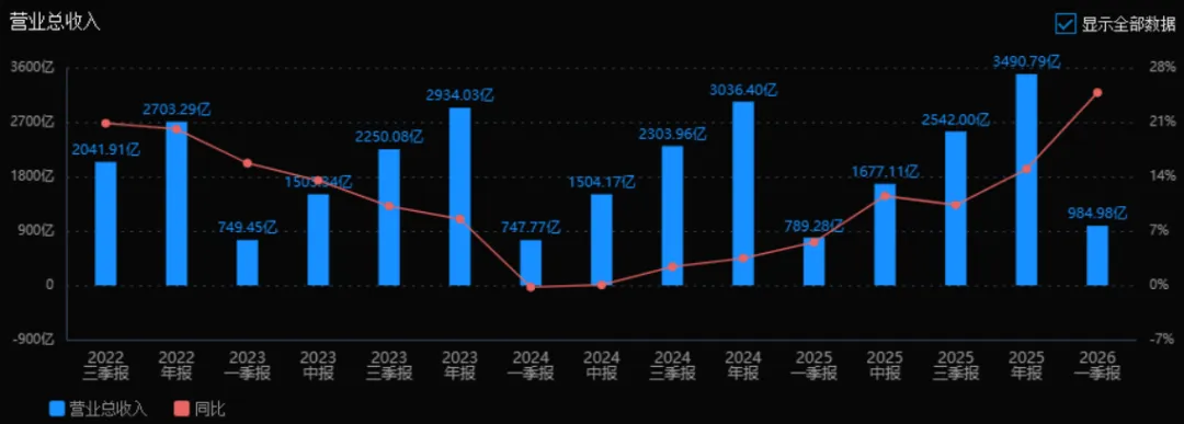 2025年的营业总收入为3490.79亿元,相较于2024年的3036.40亿元增长了14.96%。评价: 公司营收增长加速(2024年同比增速仅3.49%),2025年逐季提速(一季报5.55%→年报14.96%),显示市场需求旺盛或市场份额提升,增长态势良好。