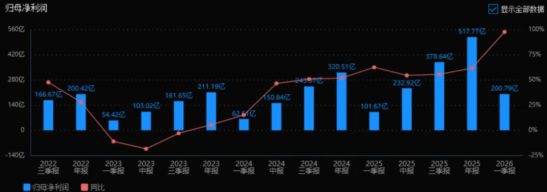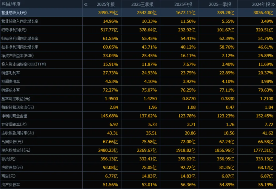 2025年的归母净利润为517.77亿元,相较于2024年的320.51亿元增长了61.55%。评价: 利润增速远高于营收增速,说明公司盈利能力大幅增强,可能源于成本控制、产品结构优化或规模效应。连续多个季度利润增速维持在50%以上,盈利弹性突出。