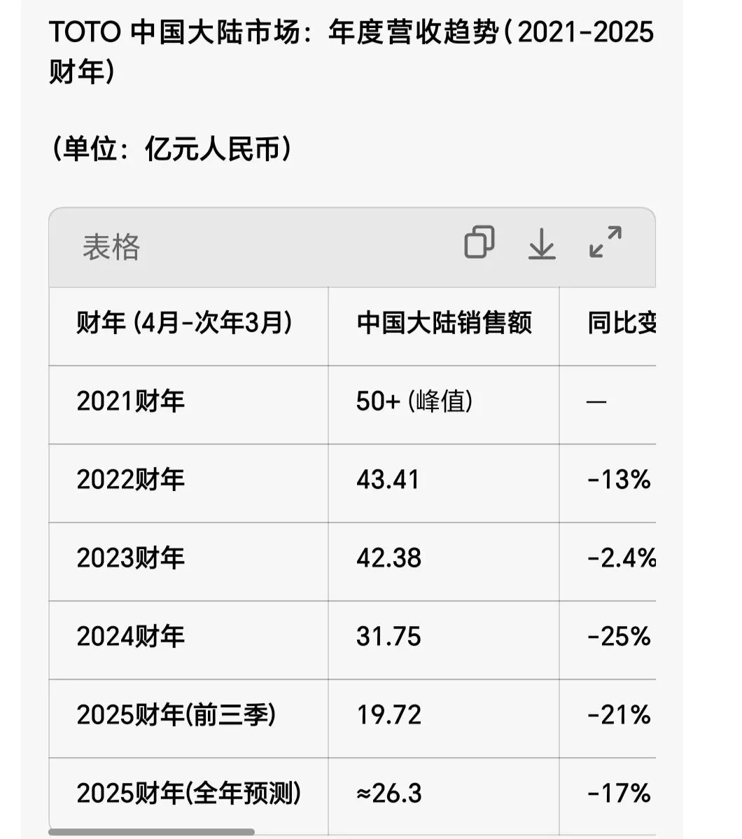 中国卫浴市场竞争格局呈现“国内外品牌交相追赶,民族品牌后来居上”的梯队化特征,按2025年销售额计算可划分为四大梯队,行业集中度持续提升,市场资源向头部品牌集中,外资品牌销售额及市场占有率继续大幅下跌,以TOTO为例,2025财年前三个季度中国大陆销售额19.72亿元,下滑高达21%,按此测算,预计2025财年销售额在26.3亿左右,从最高峰超过50亿的营收,下滑到26.5亿,TOTO仅用了五年时间。