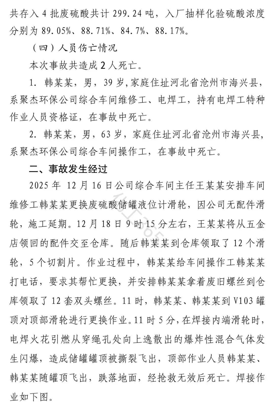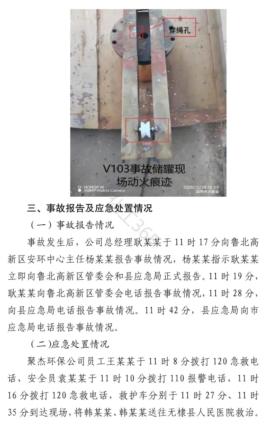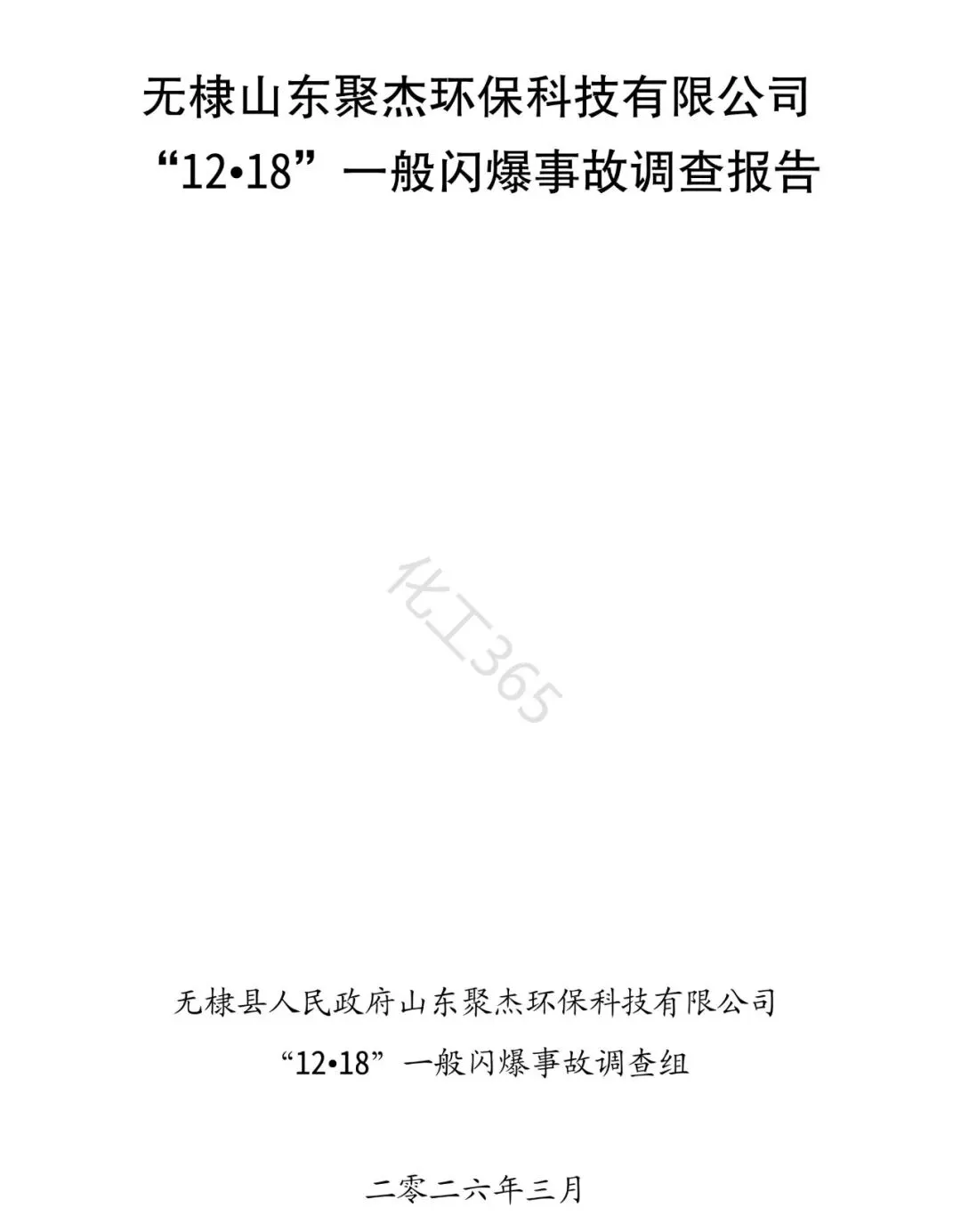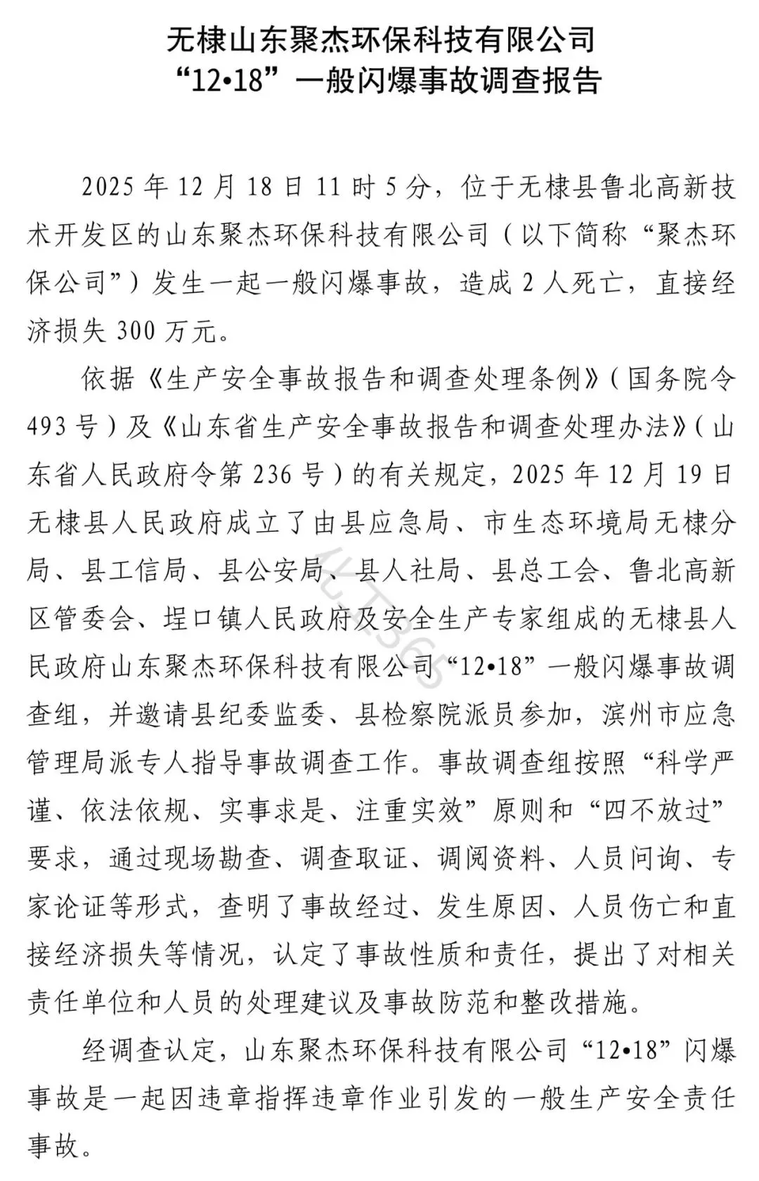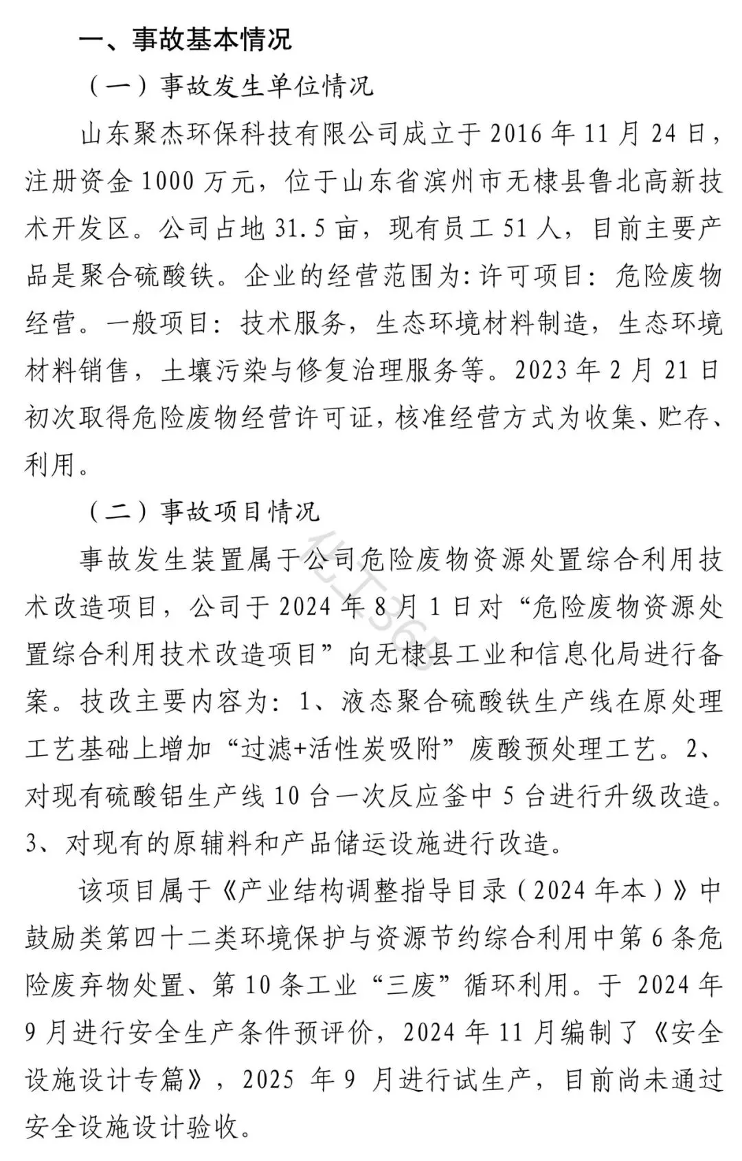 一:事故概述 2025年12月18日11时5分,位于无棣县鲁北高新技术开发区的山东聚杰环保科技有限公司(以下简称“聚杰环保公司”)发生一起一般闪爆事故,造成2人死亡,直接经济损失300万元。