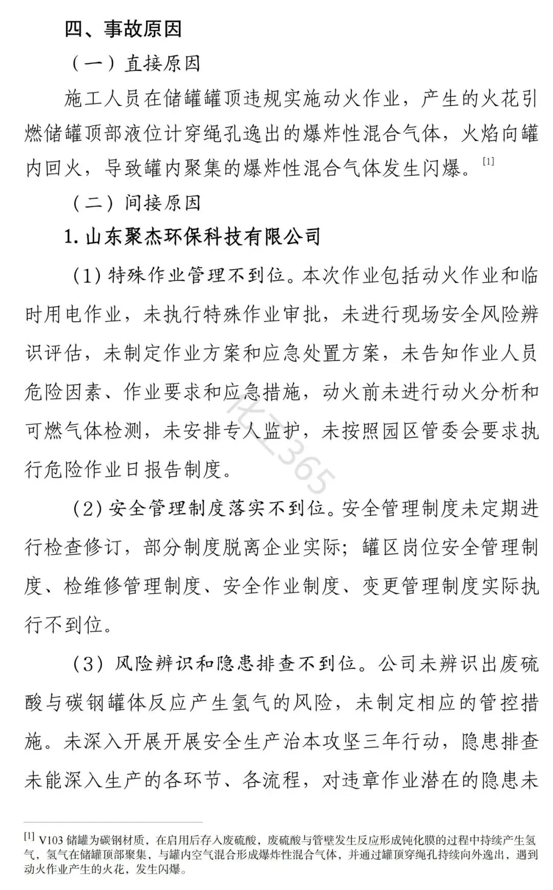 二:直接原因 施工人员在储罐罐顶违规实施动火作业,产生的火花引燃储罐顶部液位计穿绳孔逸出的爆炸性混合气体,火焰向罐内回火,导致罐内聚集的爆炸性混合气体发生闪爆。