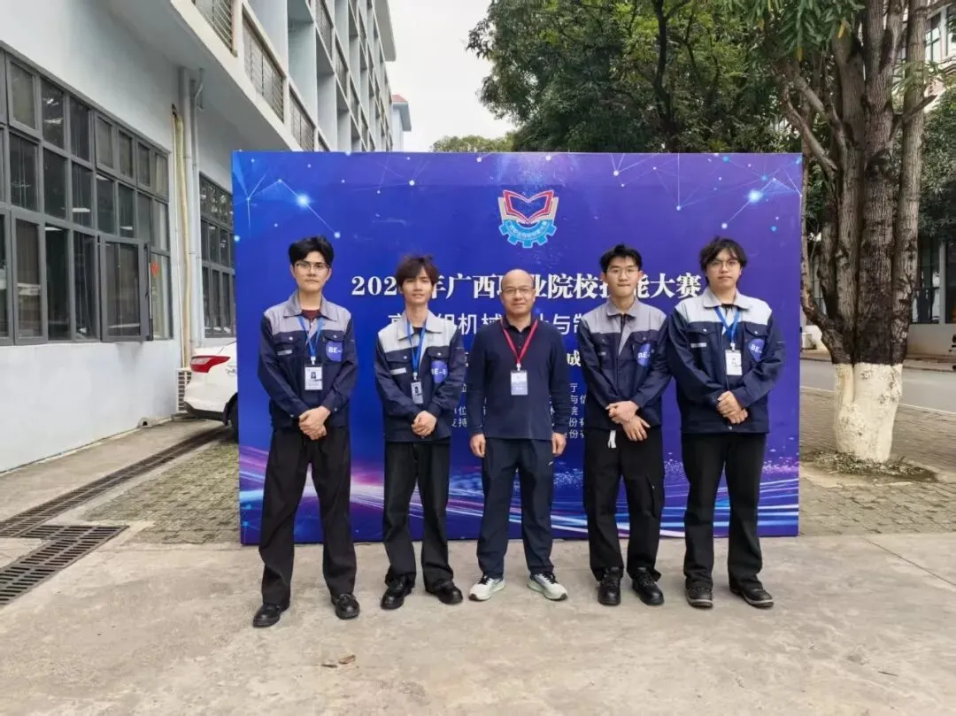 这支来自智能工程学院机械设计与制造专业的创新战队,由廖世宇、刘广昌、郑登锡、周文伟四名学子组成。在丘立庆、伍贤洪两位指导老师的带领下,凭借“智能贴装与精密检测装置”项目的创新设计与稳定表现,在全区16所高职院校的38支参赛队伍中脱颖而出,斩获2026年广西职业院校技能大赛高职组机械设计与制造赛道平行组金奖。