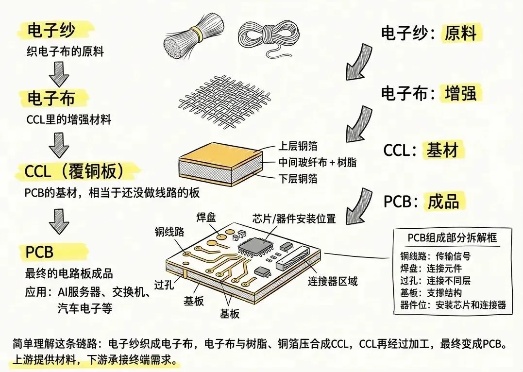 产业链:石英砂→电子纱→电子布→覆铜板(CCL)→PCB→AI服务器/光模块/先进封装