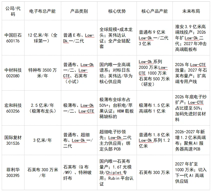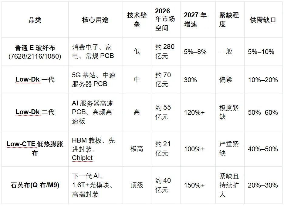 核心结论:AI算力与先进封装驱动行业结构性牛市,Low-Dk二代、Low-CTE、石英Q布供需缺口最大、涨价弹性最强;普通电子布紧平衡,高端产能刚性约束贯穿2026-2027年,国内龙头迎量价齐升+国产替代双击。