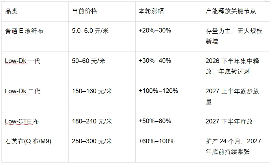 结构性紧缺:Low-Dk二代 > Low-CTE > 石英Q布,涨价持续性最强;