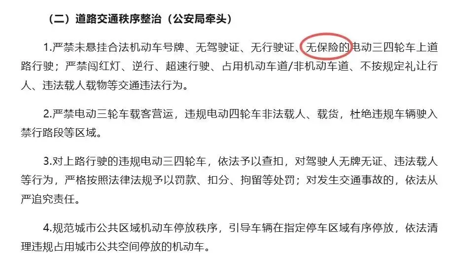 ⭕10、【安徽黄山整治三四轮车】近日,安徽黄山市多部门发布《关于开展电动三轮车、四轮车专项整治行动的通告》,对无牌上路、无驾驶证、无行驶证、非法运营、改装加装上路、无保险上路等行为严罚。