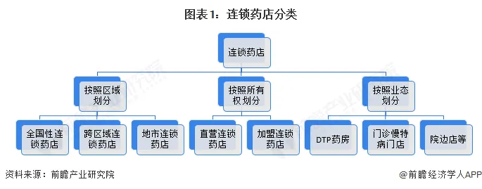 按连锁区域不同划分,可分为全国性连锁药店、跨区域连锁药店和地市连锁药店;按所有权不同划分,可分为直营连锁药店和加盟连锁药店;按照业态划分,可以分为DTP药房、门诊慢特病门店、院边店等。