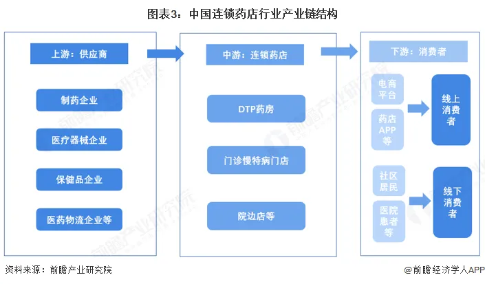 连锁药店产业链上游主要为制造企业、医疗器械生产企业、保健品生产企业以及医药物流供应商等;中游为连锁药店;连锁药店下游主要为线下客户和线上客户,线上客户通过医药电商平台、药店APP等需求获得。