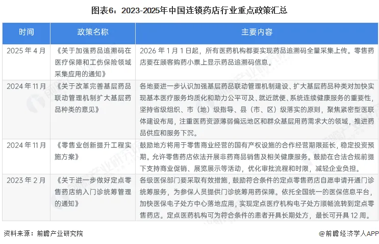 近年来,国家完善药品流通环节,完善药店等零售领域药品追溯码信息管理,推动药店纳入门诊统筹,推动药品供应下沉。2023-2025年中国连锁药店行业重点政策汇总解读如下: