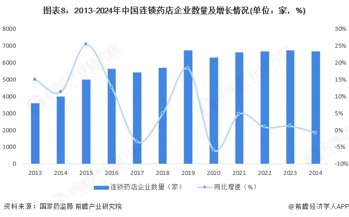 2013年以来,中国连锁药店企业数量波动变化。截至2024年底,中国连锁药店企业数量为6667家,较2023年末下降0.86%。