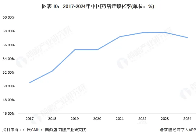 近年来,国家政策鼓励药店连锁化发展,简化药店审批流程,鼓励通过兼并重组、加盟等方式开设新门店。2017-2023年,中国药店连锁化率呈现上升趋势,2023年达到57.81%。2024年,中国药店连锁化率为57.04%,较2023年下降0.77%。
