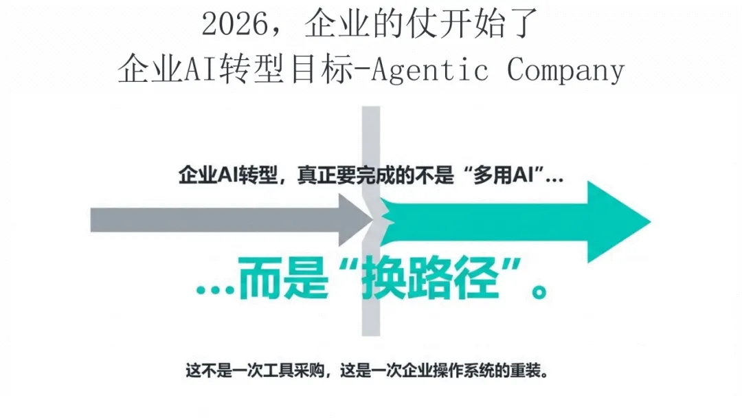 2026年企业AI转型的核心逻辑已从工具采购转向组织操作系统重装,终极逻辑为Token-Agent-Attention,目标是打造Agentic Company(智能体驱动型企业),通过数字员工、企业级智能业务单元、AI领导者与全新价值链四大标准实现深度转型。