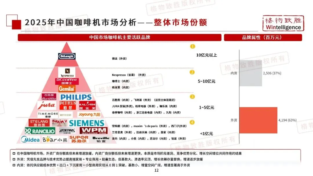 竞争格局中,外资品牌凭借技术与品牌优势占据高端与专业市场,份额较高但增速放缓;国产品牌依托供应链成本优势,在家用与小型商用领域快速突破,增速显著领先。