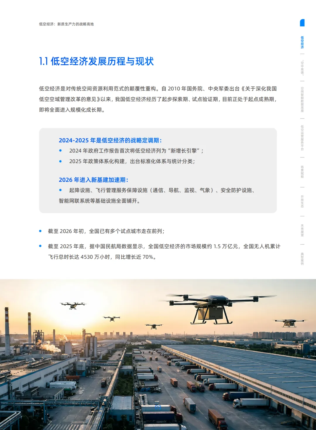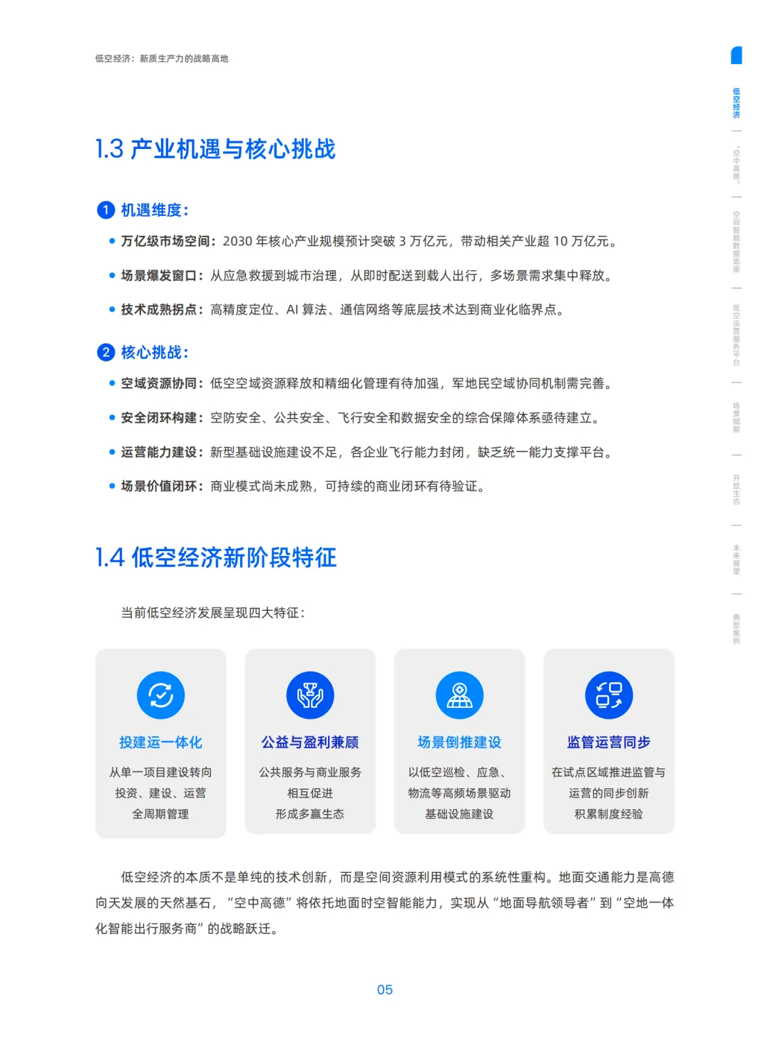 我国低空经济已从试点探索进入规模化商用关键期,2026 年《民用航空法》首次从法律层面支持低空经济,被列为新兴支柱产业,预计 2030 年核心产业规模超3 万亿元。当前面临空域协同、安全闭环、运营能力、商业模式四大挑战,呈现投建运一体化、场景倒推建设等特征。