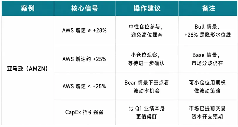 如果 AMZN 实际 AWS 增速验证 Bull 情景(≥+28%)→ 交易重心切换到AI 基础设施关联标的。