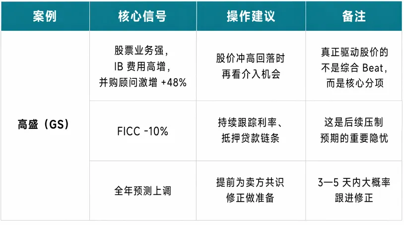案例:高盛(GS)Q1 2026,营收 EPS 全面 Beat,头条新闻一片叫好。