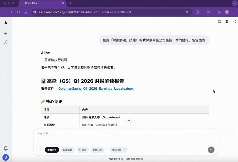 ? 提示词:“使用「财报解读」技能:帮我解读高盛公司最新一季的财报,包含图表。”