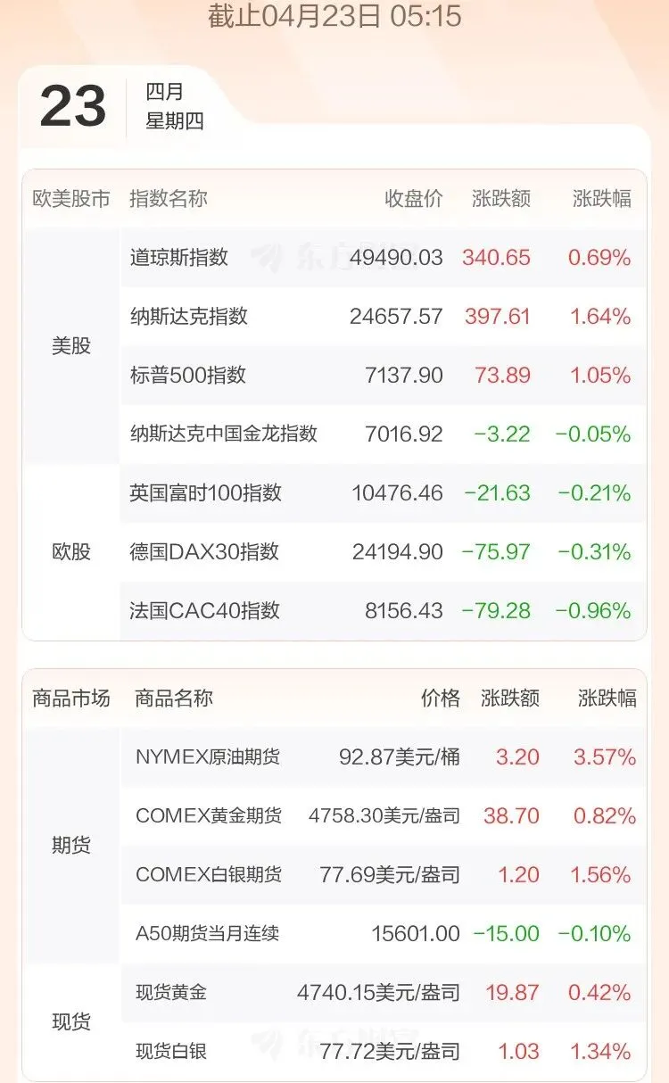 4月22日,美股市场全线收涨,三大指数集体走高。纳斯达克综合指数与标准普尔500指数双双刷新收盘历史新高。截至收盘,道指涨340.65点,涨幅0.69%,报49490.03点;标普500指数涨73.89点,涨幅1.05%,报7137.9点;纳指大涨397.61点,涨幅1.64%,报24657.57点。