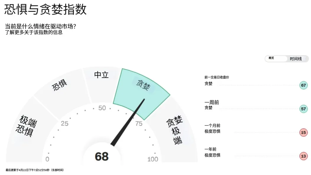 CNN 恐惧与贪婪指数为采用美股市场情绪相关变数所编製的综合指标,其中变数包括:市场动能、股价强度、股价广度、 Put/Call Ratio 、市场波动、避险需求、垃圾债券需求。该指数计算这些单独的变数偏离其平均值的程度,并赋予相同权重。其中 100 代表市场最贪婪,0 代表市场最恐惧。 来源:财经M平方