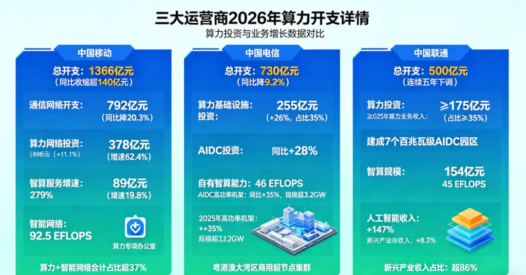 中国移动的动作最大:算力网络投资378亿元,同比暴增62.4%,这个数字放在全球电信运营商里都绝无仅有。中国电信跟进投入255亿元,同比增26%;中国联通虽然总体规模最小,但算力投资占比同样超过35%——联通董事长董昕明确说过,2026年资本开支要严格控制在500亿元,但算力的钱一分不会少。