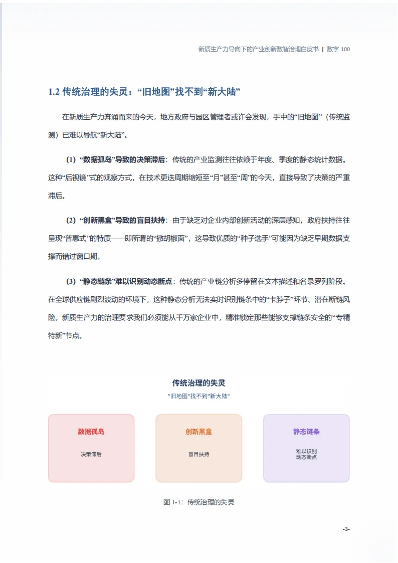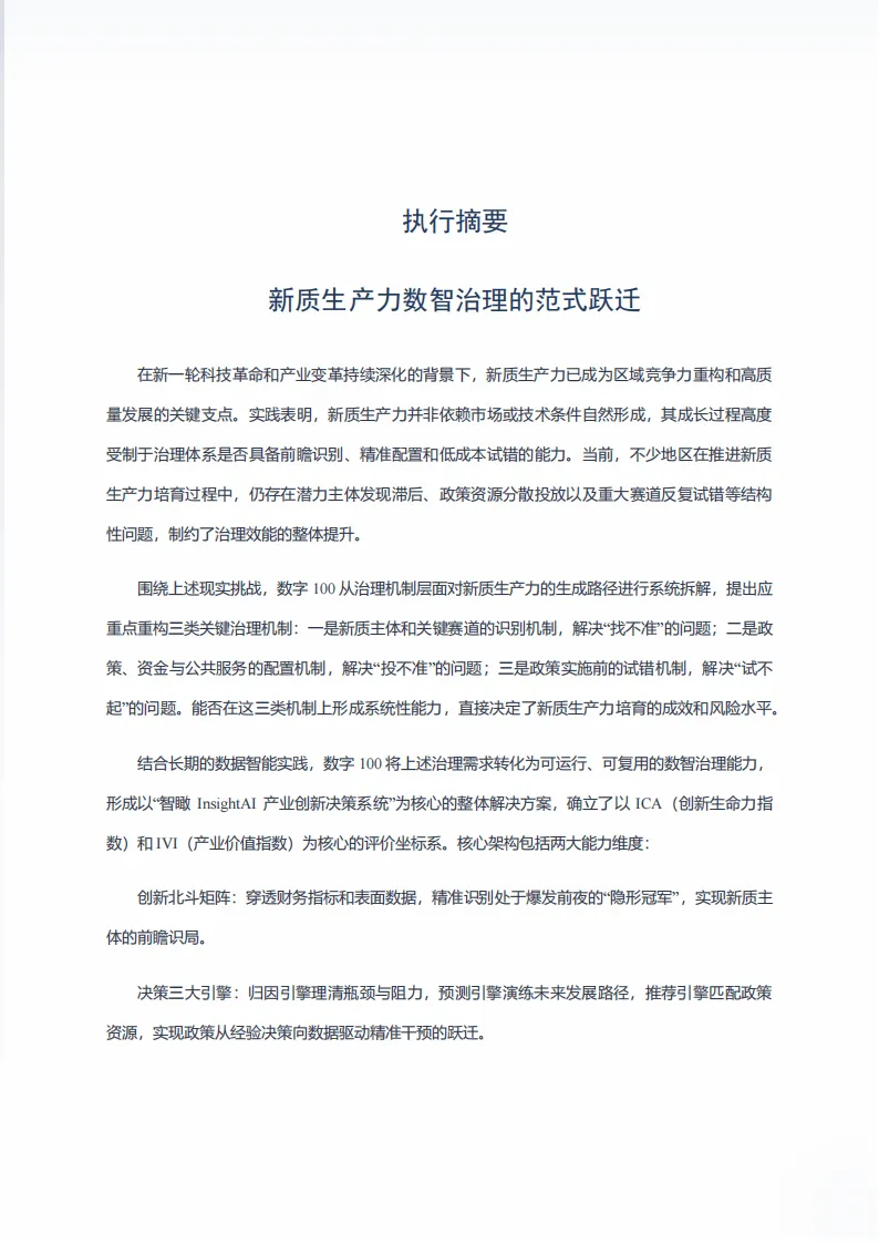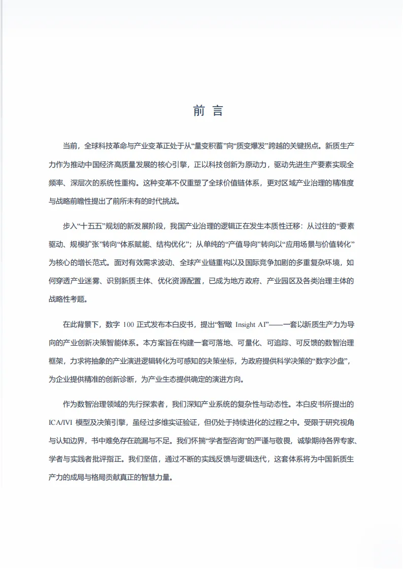 这份由北京数字一百信息技术有限公司发布的白皮书,聚焦新质生产力发展背景下产业治理的转型需求,提出以智瞰InsightAI为核心的数智治理解决方案,破解传统治理痛点,推动产业治理从经验驱动向数据智能驱动升级。