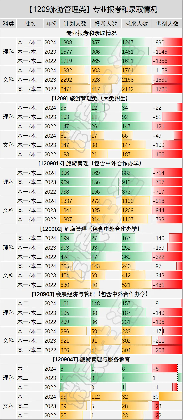 旅游管理:调剂-793人、-944人、-918人,持续为负,2024年缺918人,是最大洼地。