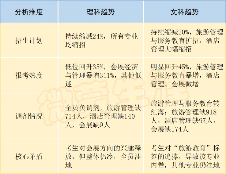 理科数据呈现出一个清晰的“整体遇冷、局部升温”的图景:旅游管理类招生计划持续缩减,报考人数低位回升,生源缺口依然巨大。细分专业中,旅游管理、酒店管理、大类招生持续负调剂,是价值洼地;会展经济与管理在2024年报考暴增,成为唯一的热度上升专业,但仍是洼地。
