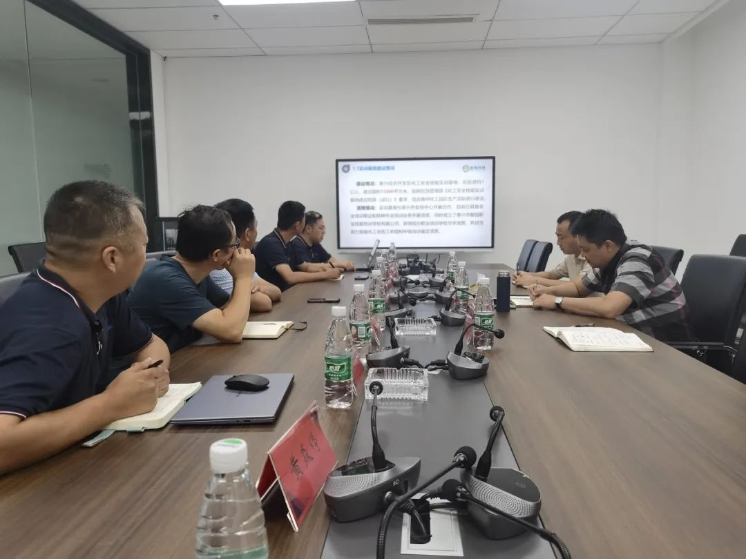 考察组来到泰兴经济开发区安全技能实训基地,听取实训基地建设运营、师资队伍、教学装备、课程设置等内容,并与泰兴市应急管理局就化工医药企业安全实训对象、内容以及相关组织工作进行深入交流。