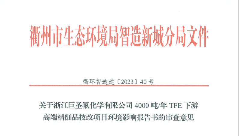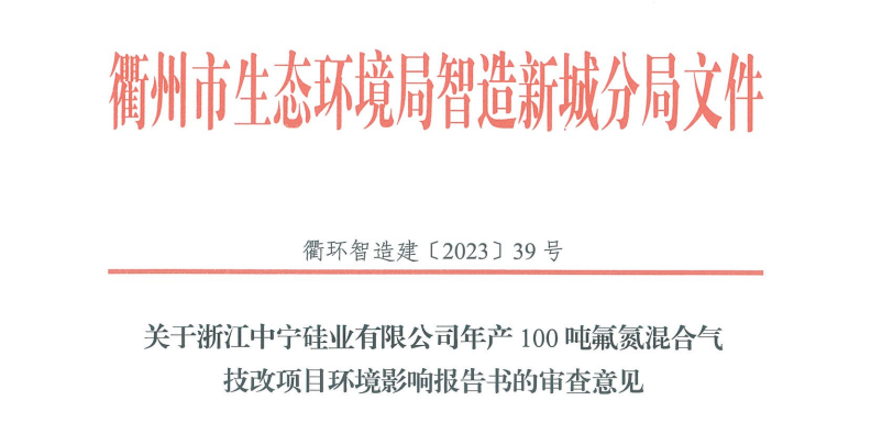 8月24日,衢州市生态环境局智造新城分局对浙江中宁硅业有限公司年产100吨氟氮混合气技改项目、浙江巨圣氟化学有限公司4000吨年TFE下游高端精细品技改项目环境影响评价文件作出审批决定并予以公告。